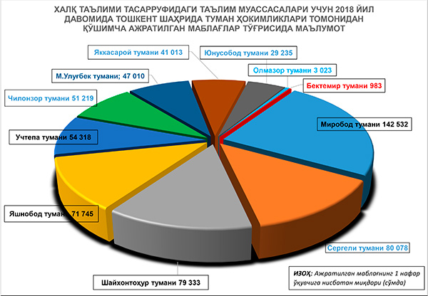 The top three outsiders in terms of the amount of funds allocated by the khokimiyats included Bektimer (983 soums per student), Almazar (3023 soums) and Yakkasaray (41013 soums) districts. These data was published on the website of the Ministry of Public Education of Uzbekistan.