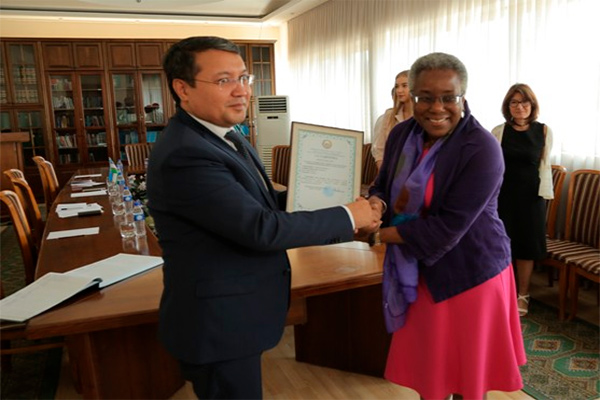 Deputy Minister of Justice Akbar Tashkulov presented a certificate of state registration of the Representative Office of American Councils for International Education in Uzbekistan to the US Ambassador to Uzbekistan Pamela Spratlen.
