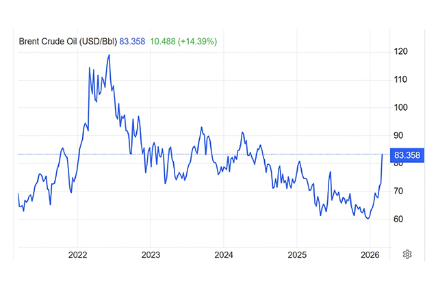 В начале 2026 года динамика мировых цен на нефть формирует для Казахстана более волатильный внешний фон, чем ожидалось ранее. На фоне обострения конфликта на Ближнем Востоке и рисков для судоходства через Ормузский пролив котировки нефти марки Brent резко выросли: в начале марта 2026 года они достигали около $82 за баррель, а 3–4 марта цена составляла примерно $82,2–83 за баррель, что отражает краткосрочный геополитический всплеск.