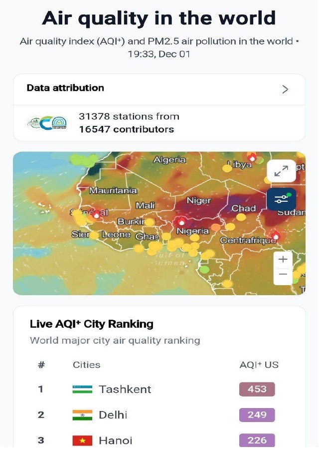 Однако через год после этих обещаний, в ноябре–декабре 2025 года, Ташкент возглавил глобальный рейтинг самых загрязнённых городов мира по версии IQAir, достигнув показателя AQI 453 — уровня ( по некоторым районам регистрировали свыше 900 AQI), классифицируемого как чрезвычайно опасный.