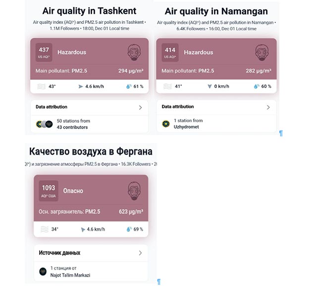 Ситуация в ноябре-декабре 2025: резкий эпизод смога в Узбекистане, столица возглавила рейтинг самых загрязненных городов в мире. AQI находятся в «опасной» зоне, публичные сообщения врачей, педагогов и предпринимателей о хронических симптомах, массовые покупки очистителей воздуха, обсуждения о миграции семей.
