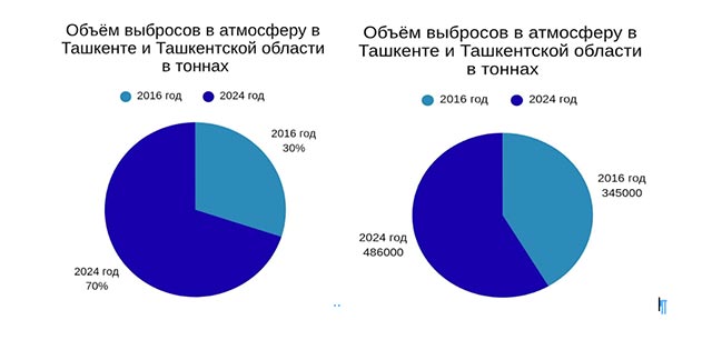 Объём выбросов в атмосферу в Ташкенте и Ташкентской области увеличился с 345 тысяч тонн в 2016 году до 486 тысяч тонн в 2024 году. Рост составил 40%.