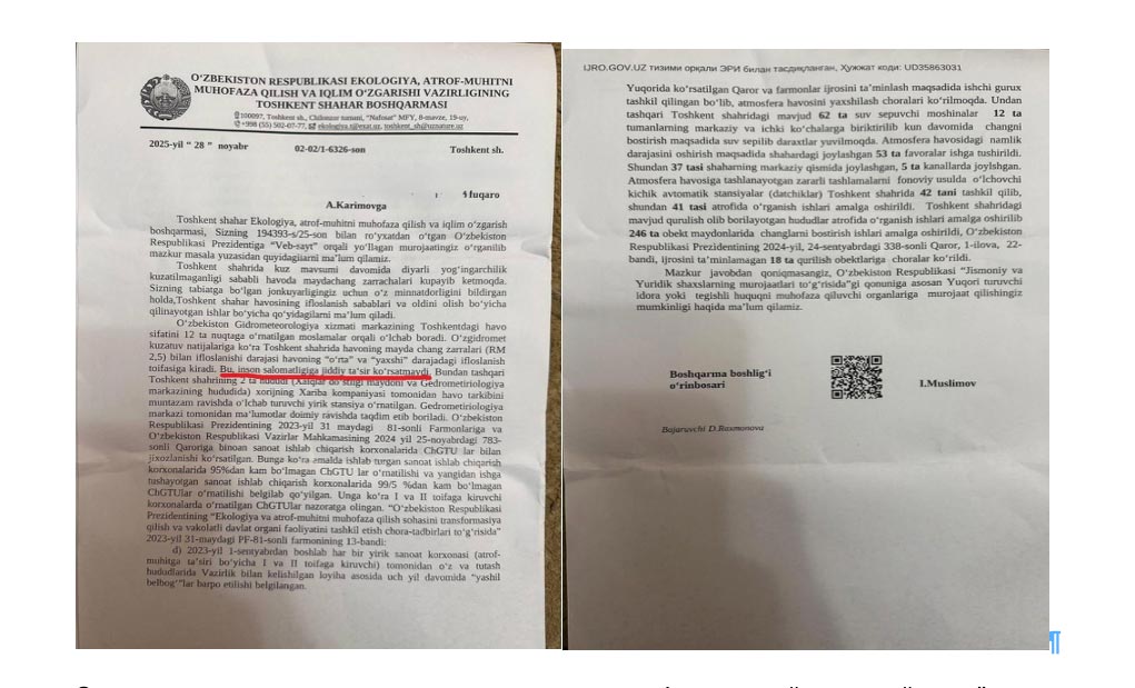 На этом фоне особенно показателен официальный ответ Ташкентского городского управления экологии на юридический запрос. В письме от 28 ноября 2025 года ведомство заявило, что текущий уровень загрязнения «не оказывает серьёзного влияния на здоровье человека» — несмотря на то, что международная классификация AQI относит такие показатели к категории «особо опасно» (Hazardous), где риск для здоровья считается максимальным даже при кратковременном воздействии.