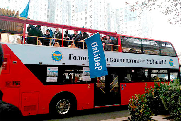 В рамках предвыборной кампании УзЛиДеП с 21 по 22 декабря 2017 года будет агитировать избирателей столицы голосовать за кандидатов в депутаты с использованием двухэтажного автобуса (даблдекера), который красочно украшен флагами и атрибутикой партии.